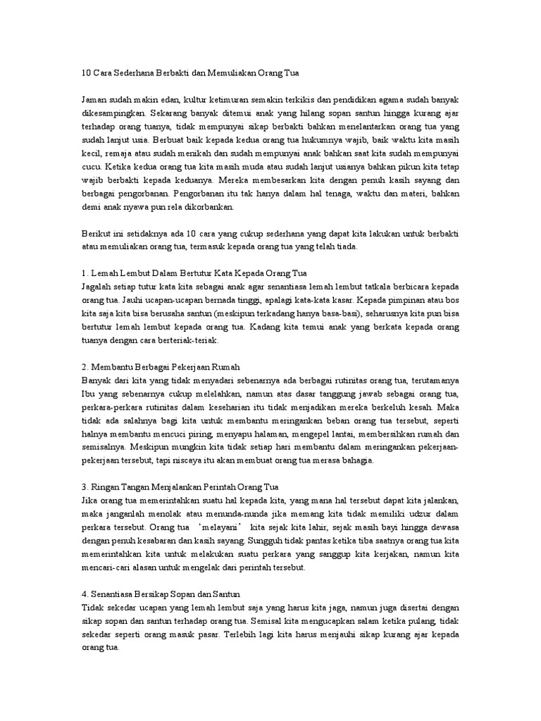 Berbakti kepada kedua orang tua kelompok vi : Cara berbakti kepada orang tua yang sudah meninggal. Selalu berbakti kepada kedua orang tua, karena kedudukan orang tua di dalam islam sangatlah istimewa. Untuk itu, inilah beberapa bentuk cara berbakti kepada kedua orang tua, sebagai bentuk ibadah kepada allah, wujud rasa syukur kepadanya dan juga untuk membahagiakan hati kedua orang yang begitu menyayangi kita. Panjang umur dan diberkahi rejekinya.